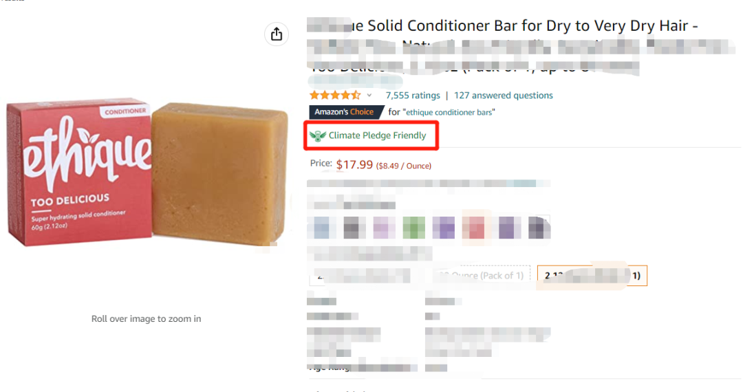 据了解,过去三个月亚马逊上的环保型美容个护产品的销售额增长了325%,销量增长了317%,例如某款带有气候承诺友好徽章的固体护发素的在六个月内销量飙升了140倍。